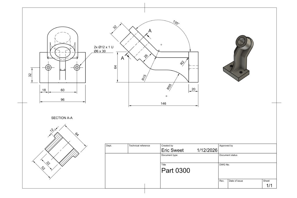 Manufacturing drawing derived from a 3D CAD model with clear dimensions, multiple orthographic views, and detailed annotations for accurate fabrication and shop use.