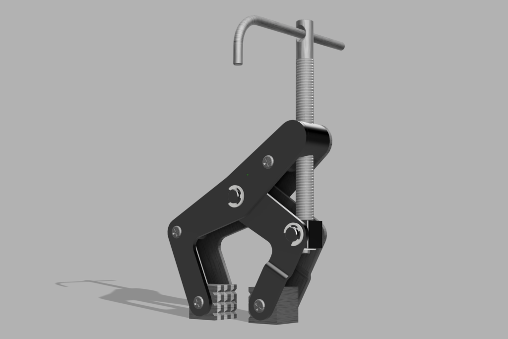Multi-part mechanical clamp assembly modeled in Fusion 360, including fasteners and constrained components to demonstrate functional movement and assembly structure.