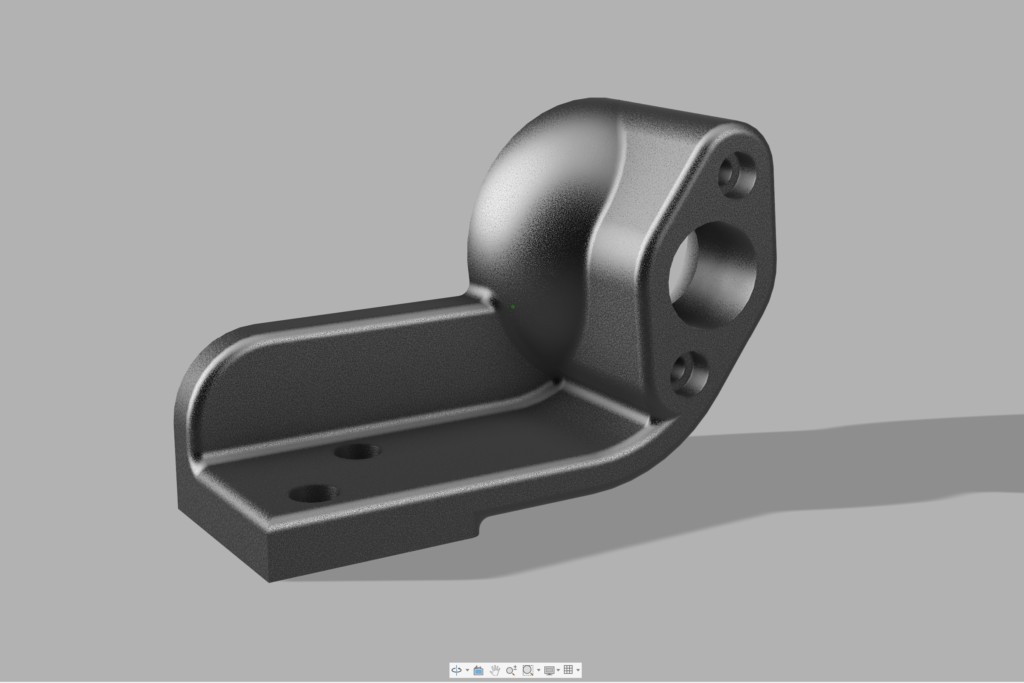 Parametric part modeled in Fusion 360 featuring a base with mounting holes connected to an upright boss with a larger central bore and smaller alignment holes and fillets.